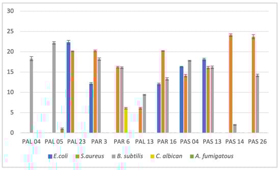 The fungal endophytes isolated from Petiveria alliacea were tested against E. coli, S. aureus, B. subtilis, C. albicans, and A. fumigatous to test their production of antimicrobial compounds by using a dual culture assay. These initial results hinted that those isolates might produce bioactive compounds. They were then tested using agar well diffusion assay techniques (Figure 4). The zone of inhibition calculations was calculated based on agar well diffusion techniques as it was more reliable than the dual culture bioassay technique.