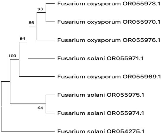 The eight isolates showing strong antimicrobial activity (>20 mm) from fungal crude extracts were chosen to sequence the internal transcribed spacer region (ITS) of ribosomal DNA. Sequenced data revealed, as shown in Table 5, that Fusarium solani, F. oxysporium, and F. proliferatum are the main endophytic fungi that are responsible for antimicrobial activity. All the sequenced fungal isolates were Fusarium, which belongs to the Phylum Ascomycota, Class Sordariomycetes, and Order Hypocreales. Phylogenetic tree analysis demonstrated that Fusarium oxysporium OR055973.1 formed the group with F. oxysporium OR055970.1 with a strong bootstrap support of 93%. Similarly, F. solani OR055975.1 and F. solani OR055974.1 form a group with a bootstrap value of 64%. Results indicate that all the sequenced isolates belong to the same genus, Fusarium.
