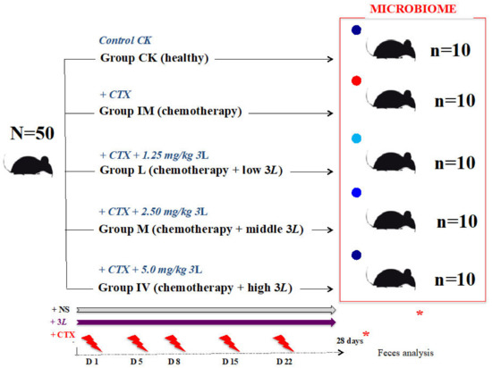 Lactobacillus tritherapy experimental model in rats undergoing CTX chemotherapy conditions. After twenty-eight days of chemotherapy (cyclophosphamide CTX, 10 mg/mL), the red dot represents the immune-attacked group with depleted gut flora. In that order, CTX was administered to rats on D1, D5, D8, D15, and D22. Continuous perfusion of normal saline (NS) was used. Groups L, M, and H rats were given a probiotic medication (one dose) daily. Lactobacillus (3L: L. acidophilus SD65, L. casei SD07, and L. plantarum SD02). L: low dose (1.25 mg/kg); M: middle dose (2.50 mg/kg); H: high dose (5.0 mg/kg). The blue dots represent the groups that have kept their gut flora close to control healthy conditions (Lactobacillus-treated groups). The dark blue dot represents the group (high 3L) with gut flora (microbiome) that is highly similar to control healthy conditions (CK). Chemotherapy begins in the +CTX groups at time 0. After twenty-eight days of treatment (D28), fecal samples were collected in each group in order to conduct a full complete thorough workshop on microbiome analysis and a group-variation comparison (*). N = total number of rats in the experiment; n = number of rats per group.