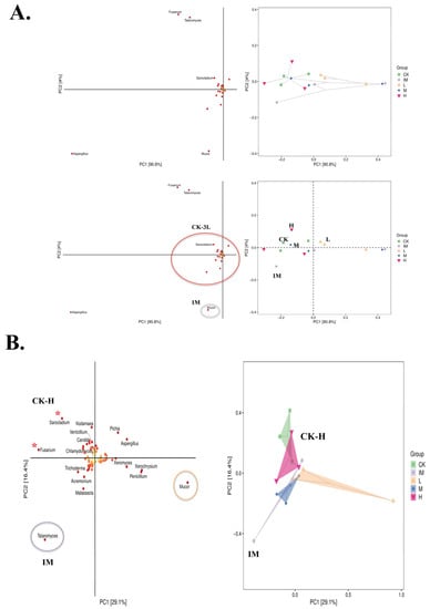 Orthogonal Projections to Latent Structures and Discriminant Analysis (OPLS-DA) showed Mucor and Talaromyces to be associated with ill conditions (chemotherapy alone), but a wide range of microbes to be associated with control and chemotherapy + high Lactobacillus conditions (Figure 2B). The OPLS-DA analysis showed that the distances between the CK and H groups were very small, while the L, M, and IM groups were clearly separated. Fusarium, Sarocladium, Kodamaea, Verticillium, Candida, and Chlamydomyces were among the fungi with overlapping distributions in the two groups, CK and H. Trichoderma, Acremonium, and Malassezia were more closely associated with the Lactobacillus groups H, M, and L. Pichia and Aspergillus were separated from this group but mixed with the CK control group. Microbial fungi, such as Mucor, Talaromyces, Xeromyces, Xerochrysium, and Penicillium, were associated with CTX and the immune-damage group (Figure 2A,B).