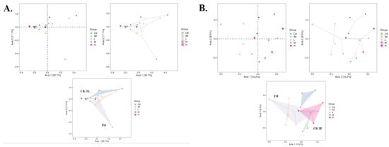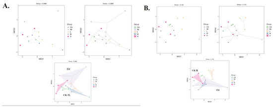 Unweighted UniFrac Nonmetric MultiDimensional Scaling analysis of CTX + 3L rat groups. Each point represents a different sample, and different colored points represent different groups (CK: control, healthy conditions; IM: immune-attacked, ill, CTX treatment; L: 3L-low dose; M: 3L-middle dose; H: 3L-high dose). The shorter the distance between the two points, the greater the similarity between the two samples in terms of microbial community structure. (A) Bray–Curtis index (common, ellipse, and hull). (B) Jaccard index (common, ellipse, and hull). In (A,B), the distance between the two samples or groups is very close, and the similarity of the microbial community structure between the two samples or groups is very high (in (A): CK and 3L; in (B): CK and H; R(v3.1.1), BGI Co., Ltd.).