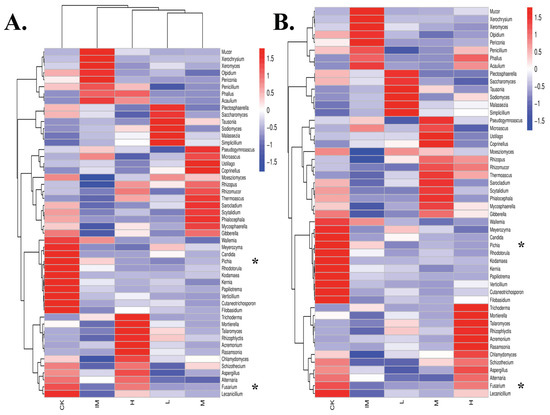 Clustering of fungal species based on abundance (heatmap) in rat samples in relation to CTX chemotherapy, + 3L-treatment, and improved gut microbiome strength. Fungal genus-level log-scaled percentage heatmap in rat groups. Different colors represent various groups: (1) normal (control healthy, CK), (2) ill (immune damaged, IM), (3) chemotherapy + 3L-low dose (L), (4) chemotherapy + 3L-middle dose (M), and (5) chemotherapy + 3L-high dose (H). The similarity of all fungal species is indicated by longitudinal clustering between the five rat groups. Horizontal clustering denotes the resemblance of specific fungal genera among the five rat groups (CK-H). The closer the distance and the shorter the branch length, the more similar the genus composition is between the groups and samples. (A) Hierarchical clustering based on both groups and taxa (variables: columns and rows). The relative abundance of specific fungal genera is used to link groups (map both clustered). (B) Hierarchical clustering on taxa (variable: rows). The ordering of groups or samples is unaffected by the relative abundance of fungi (map taxa clustering). Fifty differentially regulated fungi are shown in the genus heatmap of rat groups in relation to chemo/3L. * shows a lack of Pichia in Lactobacillus groups and an abundance of Fusarium in both CK and H. Color gradients represent the amounts of individual fungal genera. The color gradation from red firebrick to navy–blue represents a decrease in the abundance of the fungal genus (R(v3.1.1), BGI Co., Ltd.).