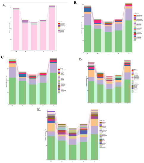The Venn Diagram depicting the relationships between the five groups in relation to chemotherapy and Lactobacillus suggested a relationship between healthy control and CTX + increasing dose of Lactobacillus spp. (CK and M-H; Figure S1). The circles’ position, configuration, and overlap, indicating the relationships between the groups, showed a gradual increase in gut flora and overall health depending on the Lactobacillus spp. complement dose (L-to-H; Figure S1). The IM group (CTX alone) was further along the bottom, representing a higher number of total unique OTUs (17.24%), similar to the L dose (number of total unique OTUs: 15.82%). The Venn diagram showed that the core microbiomes in the H and control groups were related when we looked at the number of total unique OTUs (10.52–10.82%). However, the M complement doses of Lactobacillus spp. remained too closely related to CTX alone conditions (15.07%; Figure 2A). The middle complement dose (×2, two-fold) fell between the control (CK) and immune-damaged (IM) groups (Figure S1). The H-dose group was opposite the IM group, with no overlap with the control group (CK). As a result, increasing the Lactobacillus concentration (more than fivefold) appeared to be required to produce an even more significant beneficial effect on the microbiome of rats treated by CTX (Figure S1).