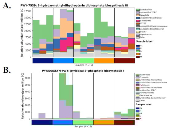 Finally, the bacterial species composition of the various metabolic pathways was examined using the stratified sample metabolic pathway abundance table (PATH_abun_strat.TSV), which was based on the significantly different metabolic pathways. Even low-level bacterial taxa were used to help label particular metabolic pathways in the MetaCyc database [98]. We used the “-f $pathway” option when calling humann2_barplot_py to specify the specific metabolic pathways examined. The ordinate value was set as the relative abundance, the abscissa was arranged according to the sample group, and the samples within the group were arranged according to similarity. By default, we conducted bacterial species composition analyses for MetaCyc metabolic pathways with differences.