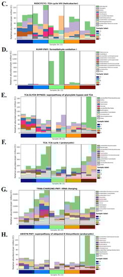 Species distribution map of distinct MetaCyc metabolic pathways in rat groups in relation to chemotherapy, the addition of 3L bioproduct to the gut, and immune strengthening. Each group had three samples tested. CK: normal (control healthy), IM: immune-damaged (ill), L: chemotherapy + 3L-low dose, M: chemotherapy + 3L-middle dose, H: chemotherapy + 3L-high dose. (A) 6-hydroxymethyl-dihydropterin diphosphate biosynthesis III; (B) Pyridoxal 5′-phosphate biosynthesis I; (C) TCA cycle VIII; (D) Formaldehyde oxidation I; (E) Superpathway of glyoxylate bypass and TCA; (F) TCA cycle I, (G) tRNA charging; and (H) Superpathway of ubiquinol-8 biosynthesis. The abscissa is composed of various sample labels that are grouped according to various colors. The groups’ samples are arranged in accordance with how closely the data match. The relative abundance of metabolic pathways is represented by the ordinate. At the same taxonomic level (genus level is used by default), the contributions of various taxon species to the metabolic pathway are displayed in various colors. With control of CK and healthy conditions for both metabolism and gut flora, a high dose of Lactobacillus (H group) is ordered.