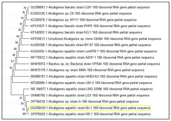 The isolate was identified as Alcaligenes aquatilis BJ-1, the highlight OQ392439.1, by constructing a phylogenetic tree using the neighbor-joining method.