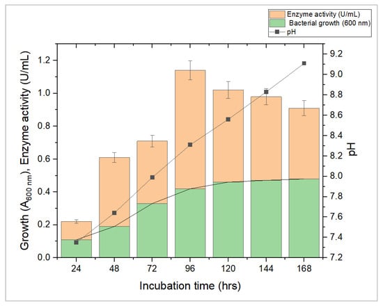 L-methioninase production was carried out in a modified M9 medium under submerged fermentation conditions. L-methioninase production using submerged fermentation has several advantages over solid-state fermentation. Firstly, in submerged fermentation, the process is carried out in a liquid medium, which allows for better control of the fermentation conditions, such as pH, temperature, and oxygen supply. This precise control over the fermentation conditions helps optimize enzyme production and yield. Secondly, it has a higher productivity rate than solid-state fermentation because the liquid medium provides the microorganisms with better nutrient and oxygen availability. This results in increased microbial growth and enzyme production. Thirdly, submerged fermentation is easily scalable for commercial production as it can be readily adapted to larger bioreactors, making it suitable for industrial-scale production. Therefore, the advantages of submerged fermentation make it a more efficient and effective method for producing L-methioninase. Hence, L-methioninase production was carried out under controlled conditions. The experiment measured enzyme activity by determining the quantity of ammonia released using the Nessler method. The enzyme activity, growth, and pH of the fermentation media were monitored up to the 7th day. The growth of A. aquatilis was monitored at 600 nm. The enzyme activity varied between 0.22 and 1.14 U/mL, with the highest activity occurring on the fourth day at pH 8.3 and bacterial cell growth at 600 nm was 0.42 (Figure 3). However, as the incubation time increased, the activity of the enzyme decreased due to the excessive secretion of ammonia in the fermentation media, causing a rapid decline in enzyme activity. In a previous study, Abu-Tahon and Isaac [36] found that an alkaline environment (pH 8.5) resulted in maximum L-methioninase production using Aspergillus ustus. Bopaiah et al. [9] reported that the Bacillus haynesii JUB2 strain achieved maximum enzyme activity at pH 8.0.