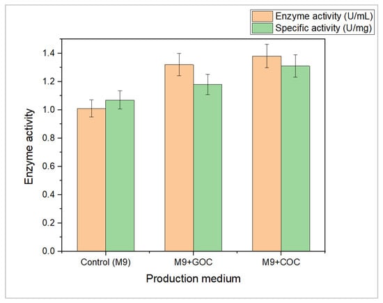 Agricultural waste has been explored as an alternative and reliable carbon and energy source for developing valuable enzymes. The present study investigated COC and GOC as substrates for L-methioninase enzyme production. Results showed that M9 medium containing COC and GOC resulted in higher enzyme and specific activity than M9 medium without agro-waste, as shown in Figure 4. The protein content of the raw materials was also analyzed, with GOC found to have a higher protein content than COC due to its fatty acid content. The methionine content in GOC was also higher than in COC, ranging from 2–9% to 1–2%, which may affect enzyme production [50]. The study concluded that the amount of substrate in the media should be carefully controlled, as both excess and insufficient substrate levels may decrease enzyme yield. The optimum substrate level is required to produce the highest amount of the desired enzyme. The researcher suggests that the optimal level of the substrate should be used to achieve the best results. In this study, we focus on inducing an enzyme using different sources of amino acids. Essentially, our investigation presents an exploration of avenues to increase the production of the enzyme by providing the microorganism with the right amount and type of nutrients.