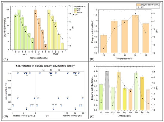 The effects of biotic and abiotic factors, such as (A) effect of salts; (B) effect of different heavy metal concentrations; (C) effect of amino acids, and (D) effect of temperature, on the production of L-methioninase enzyme at various pH levels. Reactions were performed in triplicates, and results were shown as the mean of the data obtained.