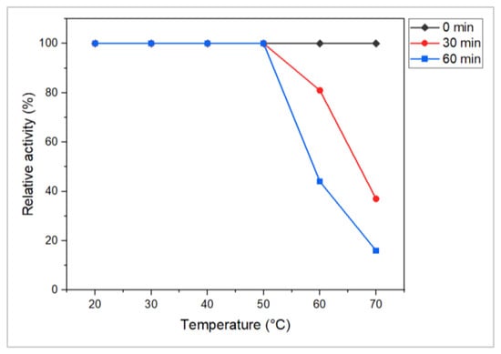Stability of L-methioninase enzyme from A. aquatilis at different temperatures. Residual enzyme activity is given as the percentage of initial enzyme activity at different times. Residual activity was measured by performing an enzyme assay after preincubating enzyme solution at different temperatures for different time intervals. Reactions were performed in triplicates, and results were shown as the mean of the data obtained.