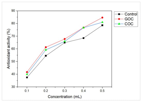 The role of antioxidants in cancer treatment has been extensively studied, as they are believed to have the potential to cause tumor regression. In this study, the researchers evaluated the ability of L-methioninase to scavenge free radicals using the DPPH assay. In a 0.2 mL aliquot of enzyme with activity of 1.07 U/mL (M9 medium as a control), 1.18 U/mL (groundnut oil cake- GOC), and 1.31 U/mL (cottonseed oil cake-COC), the findings revealed percentage scavenging activity of 54.53%, 61.3%, and 59.2%, respectively (Figure 8). This indicates that the L-methioninase samples have strong free radical scavenging ability, suggesting their potential for use in anticancer applications. In other words, the results of the study indicate that L-methioninase has antioxidant properties that could be useful in fighting cancer. A study by El-Sayed [37] found that L-methioninase from A. flavipes showed free radical scavenging capacity, further supporting the potentiality of the enzyme as an anticancer agent.