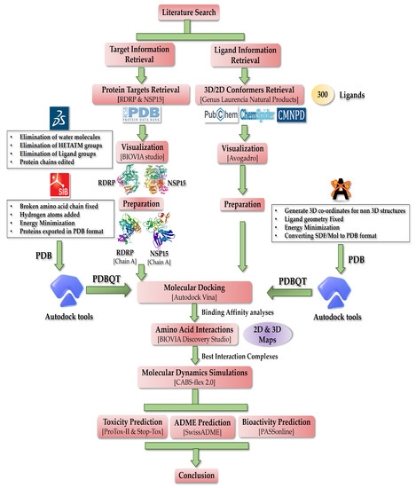 Using BIOVIA Discovery Studio Visualizer 4.5, the protein structures of RdRp and nsp15 were studied [179]. This gave us the necessary details on the quantity of amino acid chains, connected ligands, HETATM groups, etc. However, Avogadro software was first employed for visualization and afterwards for the preparation of ligands [180,181].