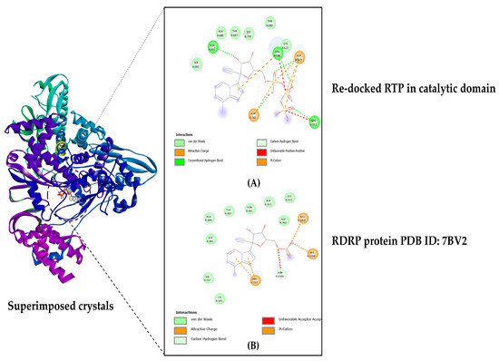 Docking validation: (A) RTP re-docked in the active site pocket located in the C-terminal; (B) Original protein crystal from RCSB PDB, ID: 7BV2.