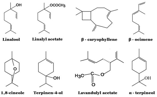 The Lavandula EO (LEO) is yellow and has an intense floral scent; it is obtained mainly by steam or hydro-distillation (yield is about 3%), and its composition varies greatly among different species and within the same species too, depending on the genotype, seasonal and climatic conditions, location, extraction methods and drying [53]. Even if over hundreds of chemical compounds can be recovered, the major components of Lavandula are oxygenated monoterpenes, monoterpene hydrocarbons and sesquiterpenes, mainly linalool (27.3–42.2%), linalyl acetate (27.2–46.6%), (Z)-β-ocimene (0.2–11.6%), terpinen-4-ol (0.70–4.6%), lavandulyl acetate (0.50–4.8%), β-caryophyllene (1.8–5.1%), (E)-β-ocimene (0.30–3.8%), α-terpineol (0.30–2.0%) and 1,8-cineole (0.10–1.2%) [53,54] (Figure 3). The contents of linalool and linalyl acetate determines the quality of the oil; on the other hand, due to the very strong influence on the scent, the contents of ocymen, cineole, camphor or terpin-4-ol should be low [35].