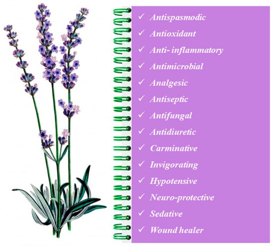 Since ancient times, Lavandula spp. and its EOs have been used in popular medicine as a natural remedy [58]. Over the years, it has been studied for its high content of bioactive compounds able to exert beneficial effects on human health and well-being. In particular, the richness in phenolic compounds confers to lavender EOs a high antioxidant activity due to a protective effect against the oxidative damage caused by free radicals [16]. The production of free radicals is a physiological event normally occurring in our bodies: a certain number of free radicals is essential to protect us from infections by viruses and bacteria, but an excessive amount of ROS (oxygen free radicals) is harmful since it could cause damage to various macromolecules (such as DNA, proteins, carbohydrates, lipids and enzymes), establishing a condition of oxidative stress, that is a risk factor for human health leading to cellular aging, inflammatory pathologies and degenerative diseases [53].