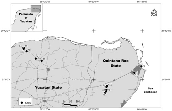 Water samples were collected from 14 selected study sites that were distributed in the states of Quintana Roo and Yucatan in the YPM (Figure 1). Three samples were collected in the urban area of the city of Cancun, Quintana Roo, and in the proximity of households (sites C1, quarry lake, C7, pond, and C8, coastal lagoon); six samples were collected in the agricultural area of the municipalities of Panaba and Dzilam in Yucatan (sites A4 to A9, open sinkholes); and five samples were collected in the recreational area locally known as “ruta salvaje,” in the municipality of Lazaro Cardenas, Quintana Roo (sites R6 to R10, open sinkholes).