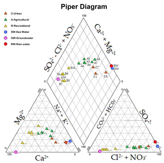 Piper’s diagram showing the values in meq/L of anions (bottom right triangle) and cations (bottom left triangle). The upper rhombus comprises the points of intersection of lines parallel to the vertical axes that join the points of anions (right triangle) and cations (left triangle) of each site. The orange triangles correspond to the urban sites C1, C7, and C8 (chlorinated). Green triangles correspond to the agricultural sites A4, A5, A6, A7, A8, and A9 (chlorinated). The yellow triangles correspond to the recreational sites R6, R7, R8, R9, and R10 (bicarbonate). The blue circles correspond to seawater, whereas the purple circles correspond to groundwater and the red circles to rainwater.