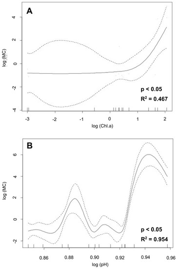 Generalized additive models (GAMs) showing a graphical expression between Chl-a (A) or pH (B) and microcystin concentrations.