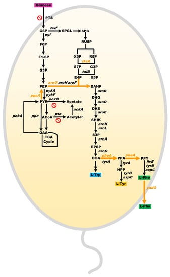 - Liu, X.; Niu, H.; Li, Q.; Gu, P. Metabolic engineering for the production of L-phenylalanine in Escherichia coli. 3 Biotech 2019, 9, 85. [Google Scholar] [CrossRef] [PubMed]