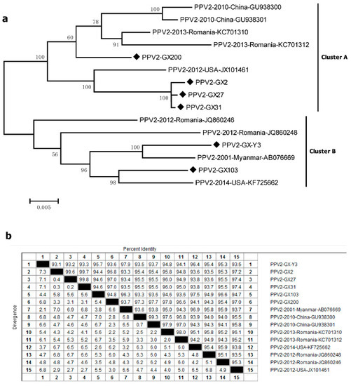 Six amplified PPV2 ORF2 sequences (PPV2-GX2, PPV2-GX27, PPV2-GX31, PPV2-GX200, PPV2-GX-Y3 and PPV2-GX103 strains) from PPV2-positive samples in this study were compared with nine other PPV2 strains available in the GenBank database. All fifteen sequences were roughly divided into two clusters, tentatively called cluster A and cluster B (Figure 2a). The sequences of PPV2-GX2, PPV2-GX27, PPV2-GX31 and PPV2-GX200 strains belonged to cluster A together with the Chinese strains (GU938300 and GU938301), Romania strains (KC701310 and KC701312), and USA strain (JX101461). The other two sequences of PPV2-GX-Y3 and PPV2-GX103 strains belonged to cluster B together with the Romania strains (JQ860246 and JQ860248), Myanmar strain (AB076669) and USA strain (KF725662). All 15 sequences were found to display a high nucleotide homology (93.1–99.8%) (Figure 2b). Analysis of the amino acid sequences showed that the amino acid difference in six strains from PPV2-positive samples ranged from 0.5% to 5.2%.