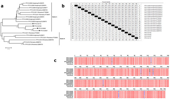For PPV3, the capsid genes of four PPV3-positive samples (GX162, GX352, GX357 and GX-Y6 strains) were sequenced and compared with other PPV3 reference strains in Hong Kong and Romania. The 19 sequences were divided into two main clusters. All of our four sequences belonged to cluster A and were grouped with Hong Kong strains (EU200672–EU200677) and Romania strains (JF738357, JF738364, and JQ868702) (Figure 3a). The maximum nucleotide difference in the four strains was 1.1%, whereas that of all the 19 PPV3 strains was 2.4% (Figure 3b). Further analysis based on the amino acid sequences revealed that the maximum amino acid difference in our four strains was only 1.3%. Compared with the PHoV strain HK3 (EU200673), strain GX162 demonstrated only two changes (V56T andV252A), strain GX352 displayed three changes (V56T, V252A and A486T), strain GX357 showed three changes (V56T, V252A and R257G), and strain GX-Y6 exhibited five changes (I13V, V56T, S114P, S239P and P524L) (Figure 3c).