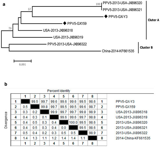 The capsid genes of two PPV5-positive samples (PPV5-GX-Y3 and PPV5-GX159) were compared with six other PPV5 reference strains. All eight sequences were roughly divided into two clusters, and the sequences of PPV5-GX-Y3 and PPV5-GX159 belonged to cluster A and were grouped with the USA strains (JX896318–JX896321) (Figure 4a). The nucleotide homology of all eight sequences ranged from 98.6% to 100% (Figure 4b), and the maximum amino acid difference in all eight strains was only 1.3%. These findings indicated that PPV5 also existed in Guangxi, and the strains detected from this area exhibited a high homology with the USA strains.