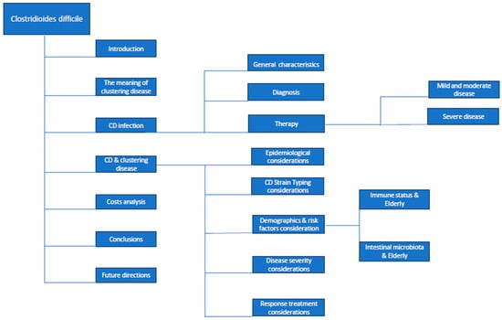 Clostridioides difficile (CD) is a gem discovered in 1935 but was thought not to be linked to any particular manifestation. Only in 1978 was it considered the agent responsible for a form of watery diarrhea related to the use of antibiotics which from an anatomical–pathological point of view manifested itself with pseudomembranous inflammation of the intestinal wall until 1978 [1]. CD originates from spots that are resistant to color and oxygen. They are also alcohol-resistant but are affected by sodium hypochlorite. Its pathogenic power is linked to the ability to produce toxins and various defense mechanisms and evasion of the host’s immunological surveillance. This causes cytotoxic damage to the intestinal wall, which can range from mild clinical pictures to creating very serious complications with toxic megacolon, septic shock, and other systemic manifestations with multiorgan failure and disseminated vascular coagulation. The people most at risk of CD are fragile, institutionalized people with the presence of persistent infections who, therefore, require cumulative doses of antibiotics, antimicrobial polytherapy, and long exposure to these agents [1]. In addition to the virulence ensured by the toxins of which it is a skilled synthesizer, another important characteristic is the high rate of recurrence which sometimes makes it quite resistant to the already few classes of antibiotics capable of inhibiting its growth [1]. The need to write this review was to combine the clustering strategy and current knowledge in order to obtain a more delineated and clearer picture of one of the most important infections related to healthcare. A detailed overview of the review is outlined in Figure 1.