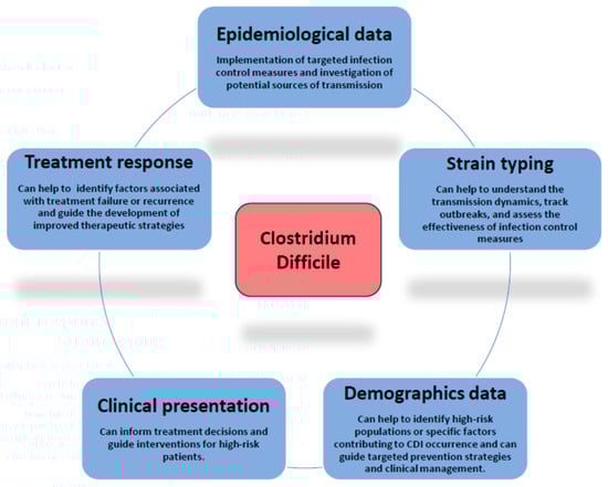 CDI is a bacterial infection that primarily affects the colon and causes symptoms ranging from mild diarrhea to severe life-threatening conditions [14,15]. Clustering CDI involves grouping cases of the infection based on various factors to gain insights into its epidemiology, risk factors, and potential treatment approaches. Here are some key aspects of clustering CDI (Figure 2):