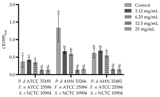 26]. Next, 135 µL of Todd-Hewitt Broth adjusted with various concentrations of crude postbiotics was added to the saliva-coated wells (3.12, 6.25, 12.5, and 25 mg/mL postbiotics concentrations). Mixed bacterial suspensions (15 µL) were inoculated into the wells and then the plates were incubated for 48 h at 37 °C under anaerobic conditions. The wells containing only inocula served as positive control groups, while the wells containing only different concentrations of postbiotics without inoculum served as negative control groups. After incubation, the biofilm formation was determined using a crystal violet binding assay [