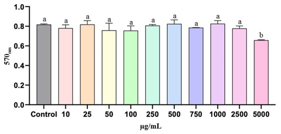 The 96-well plates were seeded with hPDLFCs at a density of 1 × 104 cells/well. After 24 h of incubation, the media were removed, and the wells were rinsed with sterile PBS. Growth media adjusted with various concentrations of crude postbiotics ranging from 0–5000 µg/mL were added to the wells. Wells without crude postbiotics were used as positive controls. The plates were incubated for an additional 24 h. A cytotoxicity assay was performed using MTT 3-(4,5-dimethylthiazol-2-yl)-2,5-diphenyltetrazolium bromide] according to the manufacturer’s recommendation with the Cell Growth Determination Kit, MTT based, CGD1, Darmstadt, Germany, Merck).