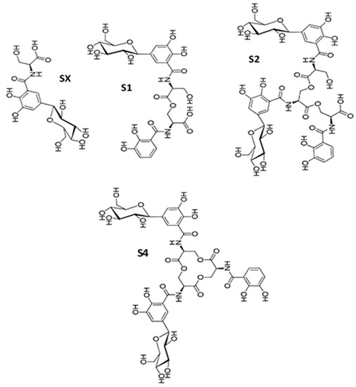 Salmochelins are enterobactin-related substances that contain a 5-C-glucosylated 2,3-dihydroxybenzoyl residue (DHB) (Figure 3). A twofold β-C-glucosylated enterobactin analogue is the main substance of salmochelin S4 [54]. Salmochelin S2 has one unglycosylated DHB-serine moiety at the C-terminal end. Additionally, salmochelin SX is a monomeric DHB(glucosyl)-serine molecule, and salmochelin S1 is a dimer with a DBH(glucosyl)-seryl-DHB-serine constitution [54].
