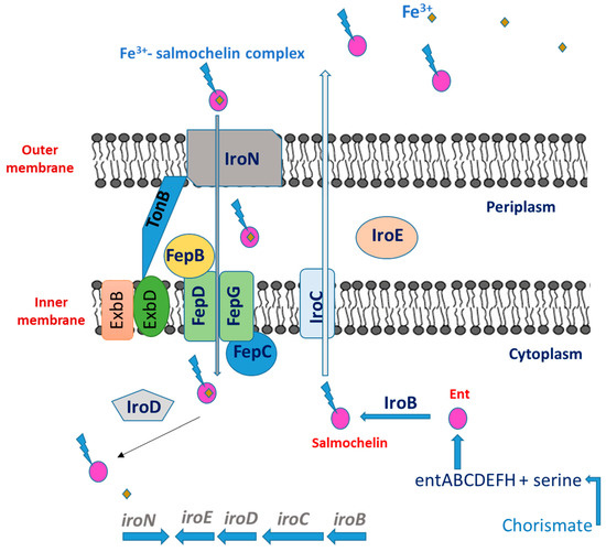 - Bäumler, A.J.; Norris, T.L.; Lasco, T.; Voight, W.; Reissbrodt, R.; Rabsch, W.; Heffron, F. IroN, a novel outer membrane siderophore receptor characteristic of Salmonella enterica. J. Bacteriol. 1998, 180, 1446–1453. [Google Scholar] [CrossRef]