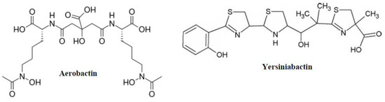 - Chaaban, T.; Mohsen, Y.; Ezzeddine, Z.; Ghssein, G. Overview of Yersinia pestis Metallophores: Yersiniabactin and Yersinopine. Biology 2023, 12, 598. [Google Scholar] [CrossRef] [PubMed]