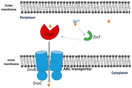 Under zinc-limiting conditions, ZinT transports Zn2+ ions to the ZnuABC transporter. It is possible that metal transfer from ZinT to ZnuA (Figure 6) occurs during the interaction of the two proteins through the formation of a binary complex since ZnuA, a periplasmic component of the ZnuABC transporter, has a higher affinity for Zn2+ than ZinT [81].