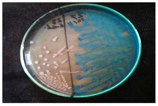 In this study, multidrug-resistant, fecal coliform isolates were isolated from nine sites throughout the effluent of wastewater treatment plants in Minya Governorate between January 2022 and February 2022. Seventy-six samples were collected into sterilized bottles and transferred immediately to the laboratory. Analyses were initiated as soon as possible after collection (not more than 24 h). All sample analysis steps were carried out under aseptic conditions. The membrane filter technique was used by placing the membrane filter on an M-FC liquid medium agar (Oxoid, Basingstoke, UK) to detect and enumerate thermo-tolerant (fecal) coliform. Then, typical blue colonies were streaked on a CHROMagar™ ESBL (CHROMagar 4, place du 18 Juin 1940, F-75006 Paris, France) plate to differentiate between different types of pathogens. Independent interpretations were given to each culture plate. The type of coloration or the colorless aspect of each of the colonies growing on CHROMagar™ ESBL was recorded. E. coli were given a dark pink to reddish color and Klebsiella was given a metallic blue (Scheme 1).