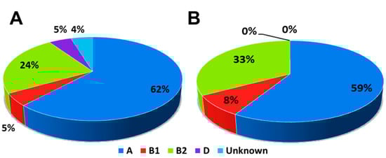 - Johnson, J.R.; Stell, A.L. Extended virulence genotypes of Escherichia coli strains from patients with urosepsis in relation to phylogeny and host compromise. J. Infect. Dis. 2000, 181, 261–272. [Google Scholar] [CrossRef] [PubMed]