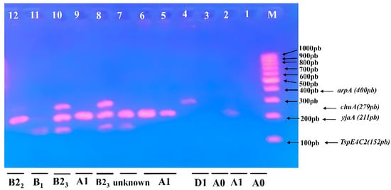 Triplex PCR-based phylogenetic profile of E. coli isolates. Lane M contained a 100–1000 bp marker showing phylogenetic genes (arpA400 bp—chuA 279 bp—yjaA 211 bp—TspE4C2 152 bp); Lane 8 and 10, subgroup B23; Lane 12, subgroup B22; Lane 11, subgroup B1; Lane 4, subgroup D1; Lane 2, 5, 6, and 9 subgroup A1; Lane 1, 3, subgroup A0, and Lane 7 is unknown.