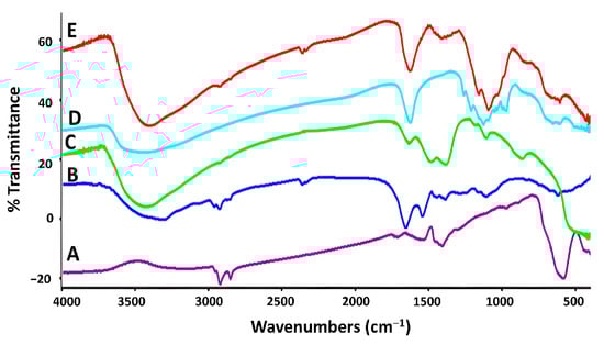FTIR spectra of bee venom honey natural product and prepared nanoparticles and nanoflowers: (A) αFe2O3 NPs, (B) ZnO NFs, (C) ZnO@αFe2O3 NFs, (D) Bv, and (E) Bv-ZnO@αFe2O3 NFs.