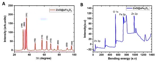 (A) XRD pattern and (B) XPS spectra of ZnO@α-Fe2O3 NFs.