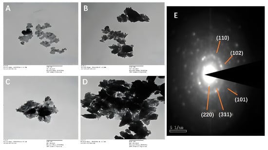 Average particle size and data regarding size diameter mean of size distributions of prepared samples: (A) αFe2O3, (B) ZnO, (C) ZnO@αFe2O3, and (D) Bv-ZnO@αFe2O3 NFs measured by TEM (scale bar = 100 nm; direct magnifications = 80,000–10,000×), and (E) the SAED patterns of ZnO@αFe2O3 NFs.