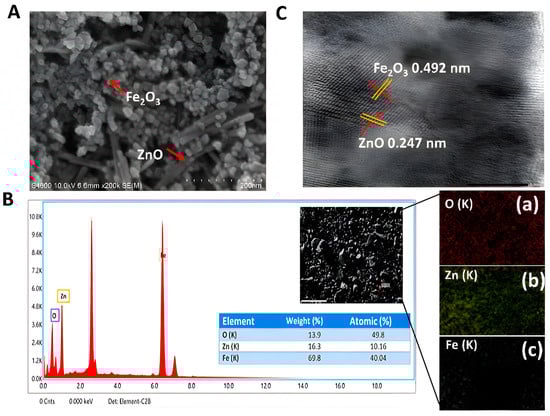 (A) SEM image (magnification 200 nm), (B) SEM-EDX microphotographs, (C) HRTEM images, and (a–c) the elemental mapping images of ZnO@αFe2O3 composite.