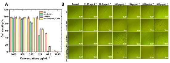 (A) Cell viability and (B) morphological features of Vero cells treated with different concentrations of Bv, αFe2O3 NPs, ZnO NFs, and Bv-ZnO@αFe2O3 NFs.