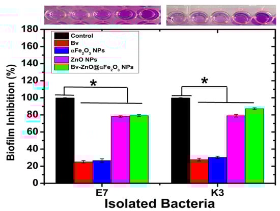 The antibacterial activity of NFs was assessed by measuring MICs and MBCs for two strong biofilm producer isolates E7 and K3. Table 4 showed that E7 MICs’ values were 320 µg/mL−1, 80 µg/mL−1, 160 µg/mL−1, and 10 µg/mL−1 while MBCs’ values were 100 µg/mL−1, 40 µg/mL−1, 97 µg/mL−1, and 20 µg/mL−1 for ZnO, αFe2O3, ZnO@αFe2O3, and Bv-ZnO@αFe2O3, respectively; on the other hand, K3 isolate MICs were 160 µg/mL−1, 40 µg/mL−1, 80 µg/mL−1, and 5 µg/mL−1 while MBCs were 80 µg/mL−1, 10 µg/mL−1, 40 µg/mL−1, and 2.5 µg/mL−1 for ZnO, αFe2O3, ZnO@αFe2O3, and Bv-ZnO@αFe2O3, respectively.