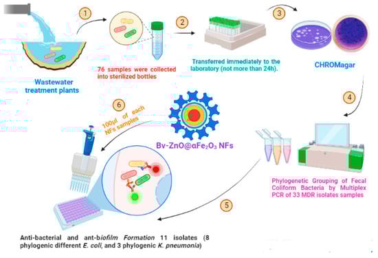 Fecal coliform bacteria can cause illnesses both in the hospital and in the community. One of the essential characteristics is multiple resistance to broad-spectrum antibiotics. Due to the excessive use of antimicrobial medications as a treatment, multidrug-resistant (MDR) bacteria like E. coli and K. pneumonia have become more common in recent years [1]. Antibiotics are an important tool in lowering the sickness or mortality caused by bacterial infections in humans. The unrestricted use of antibiotics was the primary cause of MDR bacterial strains’ establishment and dissemination [2,3]. The requirement for water will surely increase as the world population continues to rise. As a result, there will be a greater need globally for effective and cost-effective water treatment solutions. An important development could result from the industry’s adoption of nanotechnology [4]. Wastewater treatment by using nanotechnology has attracted more attention in recent years owing to its important criteria as small sizes providing large specific surface areas; nanomaterials have great adsorption capacities and reactivity with heavy metals, organic pollutants, inorganic anions, and bacteria [5].