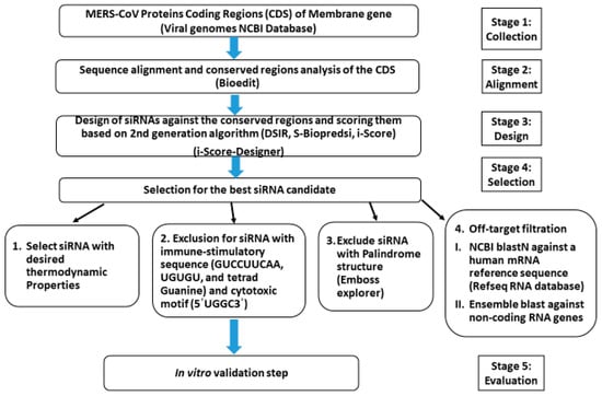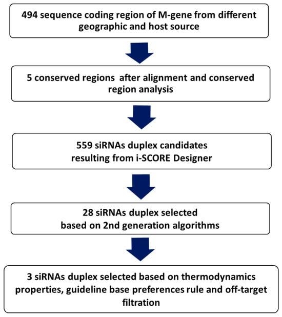 Workflow for the siRNAs in silico designing and selection steps targeting the MERS-CoV M-gene.