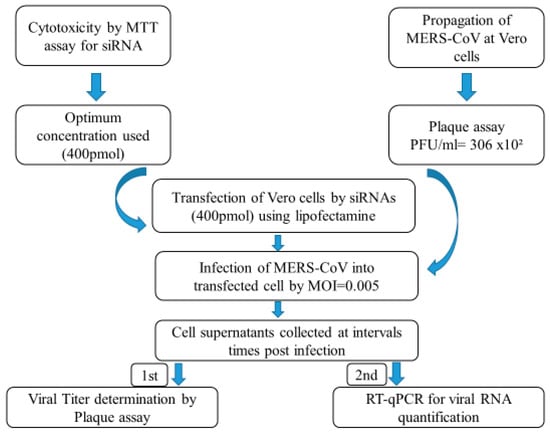 The cell supernatants of time post-infection (24 h and 48 h) for the treated and the untreated cells with siRNAs were isolated for viral RNA extraction using a KingFisher™ Flex Magnetic Particle Processor with a 96 Deep-Well Head according to the manufacturer’s instructions (Thermo, MA, USA). The purified RNA was further used for a real-time quantitative polymerase chain reaction (RT-qPCR) targeting upstream MERS-CoV E-gene using an Eppendorf Real-Time PCR System and a verso one-Step RT-PCR Kit (Thermo, MA, USA) [56]. Briefly, a total 25 µL of PCR reaction containing 5 μL of RNA, 12.5 μL of 2× reaction buffer, 0.25 μL of enzyme mixture from the kit, 1.25 µL of enhancer, 3.5 μL ddH2O, 1 μL of 10 μM concentrations of each upE forward primer (GCAACGCGCGATTCAGTT), reverse primer (GCCTCTACACGGGACCCATA), and 0.5 μL of 10 μM concentration of an upE probe (FAM-CTCTTCACATAATCGCCCCGAGCTCG-TAMRA). Thermal cycling involved 50 °C for 15 min, followed by 95 °C for 15 min, and then 45 cycles of 95 °C for 15 s and 60 °C for 60 s. Plasmid containing partial E fragment was used as a standard to calculate the viral load (copies/µL). All the experimental methods are summarized in Figure 2.