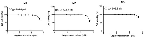 The cytotoxic effect of selected siRNAs on the Vero cells’ viability percentage is shown in Figure 5. The results indicated that there was no significant cytotoxicity on Vero cells as the half maximal cytotoxic concentration (CC50) for siRNA-M1 = 804.6 picomolar (pM), siRNA-M2 = 549.9 pM, and siRNA-M3 = 903.5 pM. The Vero cells were transfected with the three siRNAs with a safe concentration below the CC50 concentration = 400 pM. All the experiments were performed in triplicate for each siRNA and analysed using GraphPad prism software.