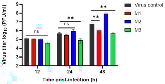 Graphical representation for viral titres (log10PFU/mL) after siRNA (M1, M2, and M3) treatment with a concentration of 400 pM at different time points post-infection with MERS-CoV. Vero cells were transfected with siRNAs (M1, M2, M3). Afterwards, Vero cells infected with MERS-CoV (MOI = 0.005) at 24 h post-transfection, then cells supernatants were collected in-triplicate at 12, 24 and 48 h post-infection (h p.i.) for each siRNA. The significant differences are indicated (** = p < 0.01, and non-significant = ns).