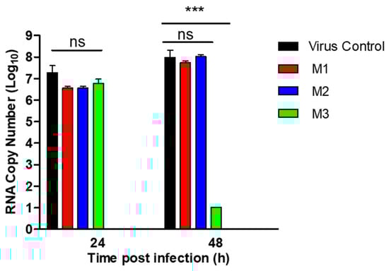 A graphical representation for the RNA copy number of collected samples after 24 and 48 h post-infection with MERS-CoV in Vero cells treated with a concentration 400 pM of the three siRNAs (M1, M2, and M3). Vero cells were transfected with siRNAs (M1, M2, M3). Afterwards, Vero cells were infected with MERS-CoV (MOI = 0.005) at 24 h post-transfection, then the cells supernatants were collected in triplicate at 24 and 48 h p.i. for each siRNA. The significant differences are indicated (*** = p < 0.001 and non-significant = ns).