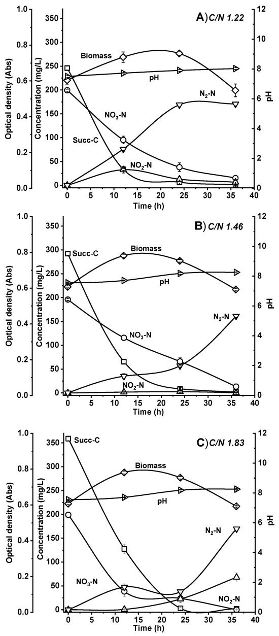 Profiles of carbon and nitrogen compounds from denitrification with P. denitrificans PD1222 under different C/N conditions (C/N (A) 1.24, (B) 1.46 Y (C) 1.83). Consumption of Succinate-C (“), NO3-N (-); Production of NO2-N(8)N2-N(C), biomass (M) and pH (c).